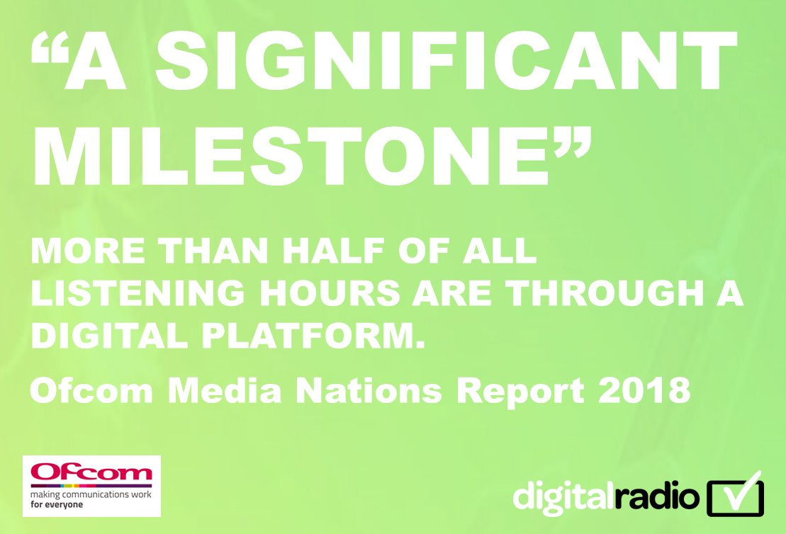 “Radio listening reached a significant milestone in the first quarter of 2018, as, for the first time, more than half of all listening hours (50.9%) were through a digital platform”, says Ofcom press release on the Media Nations Report: https://bit.ly/2O0FBsP digitalradio